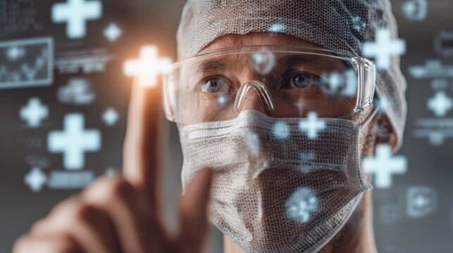doctor wears mask and cap touches glowing plus symbols on digital interface medical professional interacts with futuristic health care tech and data analytics shows positive medical progress