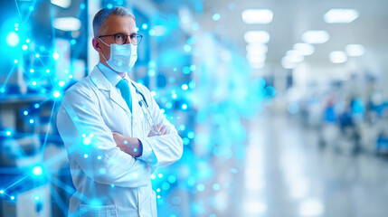 A doctor wearing a mask analyzing patient data on futuristic digital screens in a high-tech medical facility