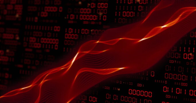 A digital design featuring a gradient red background with binary code (0s and 1s) displayed in black and orange, symbolizing technology and data.