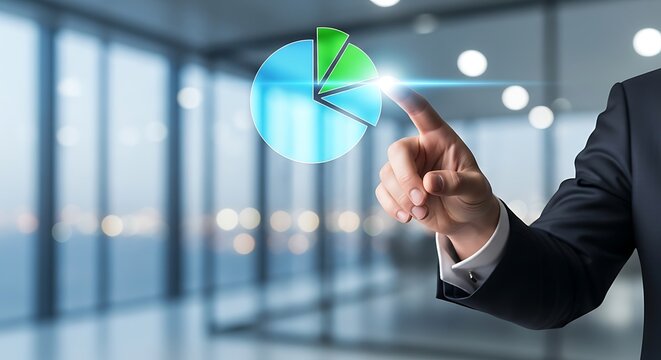 A businessman interacts with a glowing pie chart display representing data analysis and future business strategies