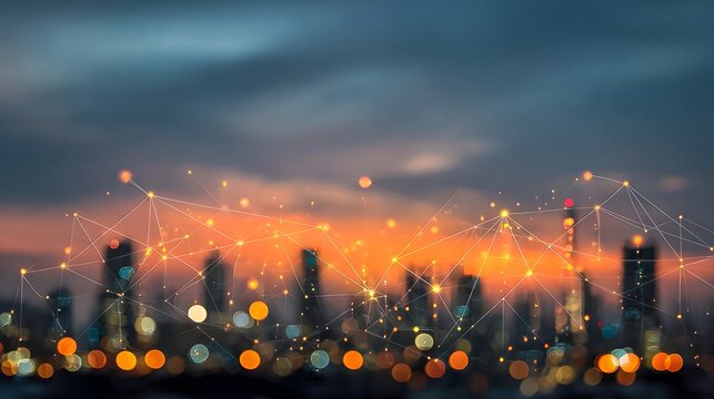 Aerial view of connected global network over city skyline at sunset. Skyscrapers light up, showing urban infrastructure growth. Digital connections span across cityscape, representing modern
