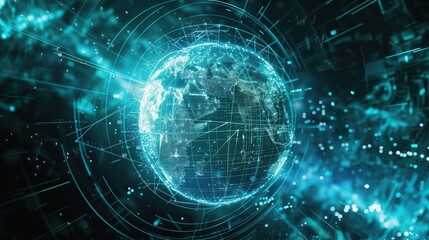Circulating stylized Earth globe in virtual data space, showing binary digits and glowing streaks