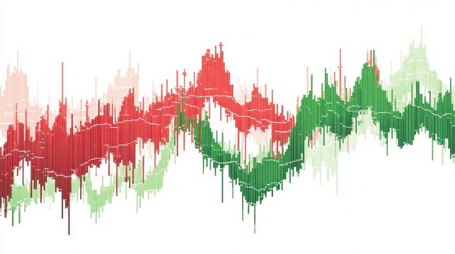 A colorful digital graphic representing fluctuating data trends, featuring green and red vertical bars indicating changes in values over time.