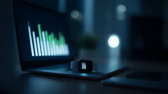 Dimly lit workspace with laptop displaying green and white bar graph, smartwatch on keyboard showing similar data visualization, soft bokeh light, and faint plant silhouette in background.