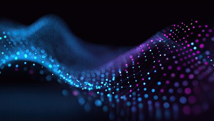 Visualization of glowing blue digital waveforms and interconnected light points flowing dynamically over a dark futuristic background with bokeh effects
