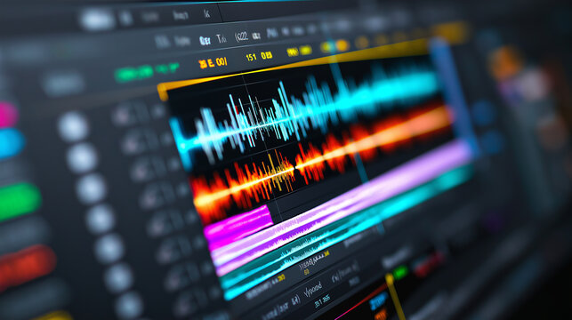 Artistic composition of a video editing application interface, showing multiple colorful sequences, audio waveforms, adjustment layers, and effects panels
