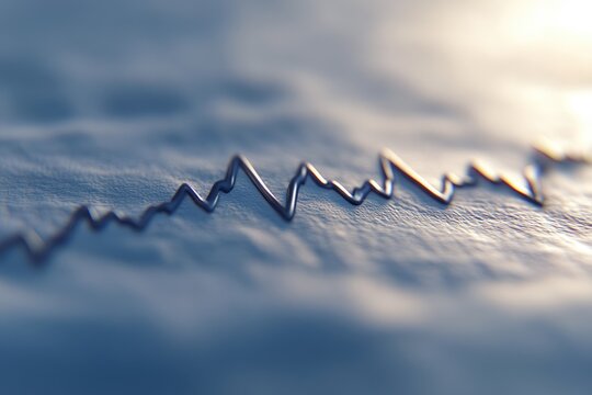 A sleek, abstract metallic waveform representing data, sound, or medical signals elegantly meanders across a soft, subtly textured blue background.