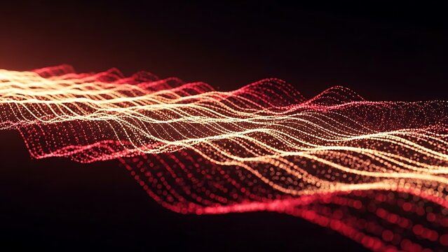 Dynamic red and orange flowing particle waves on a dark background creating an abstract digital design