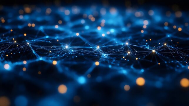 Abstract blue and yellow background with digital data wave and network pattern. Futuristic AI and cyber technology concept, futuristic design with neon glow
