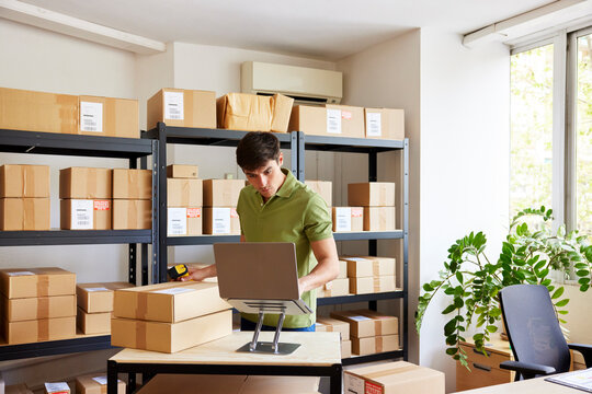 Document Management System (DMS) being setup by IT consultant working on digital tablet and laptop computer in office. Software for archiving, searching and managing corporate files and information