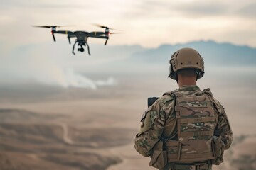 Futuristic Military Operations with Drone Surveillance and Advanced Technology in Rugged Terrain at Dusk