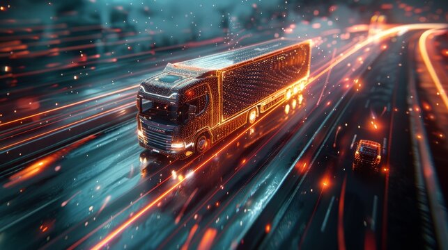 Futuristic truck on highway at night. A glowing, futuristic truck speeds down a highway at night, surrounded by vibrant light trails and a digital atmosphere.