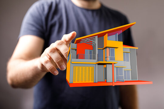 Person interacting with a miniature house representation. Exploring architecture and real estate. Digital design concept, dream home idea, visua