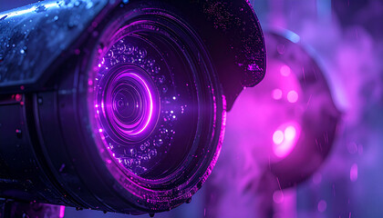 Surveillance in Neon Glow: An intimate view of a security camera under an otherworldly purple glow, capturing its lens with minute detail, representing observation.