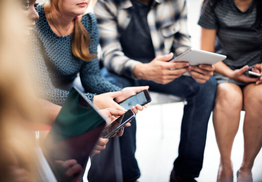Teenage students using smartphones in classroom for studying and social interaction. Diverse group of friends focused on mobile phones, technology in education, and digital learning.