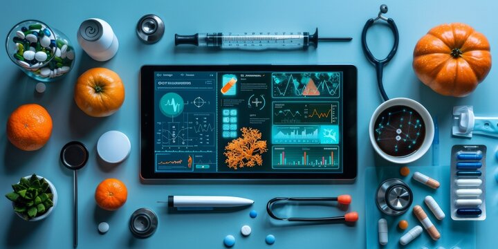 Digital medical dashboard on a tablet surrounded by health-related items and fresh produce
