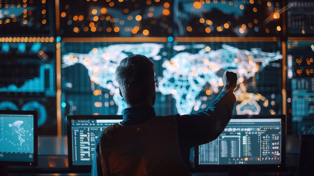 A person analyzes data on multiple screens displaying world maps and code in a high-tech environment.