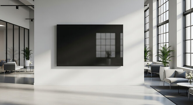 A blank, wall-mounted digital signage screen in a bright, modern corporate office lobby