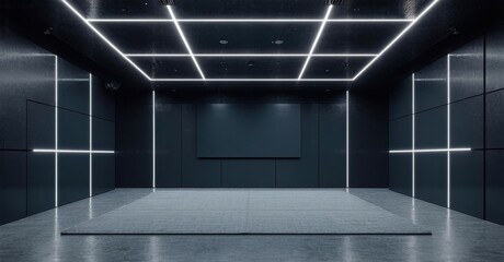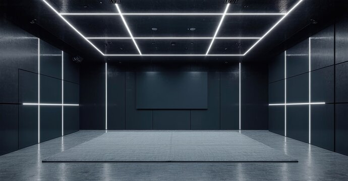 Minimalist glossy dark display off training studio with led ceiling panels