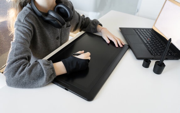 Young teenage girl using digital graphic tablet and drawing pen for new picture. Online education drawing lesson.