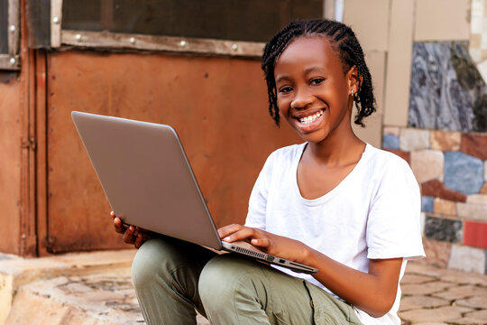 A young girl sitting on a step with a laptop