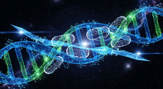 This futuristic representation of human evolution through biotech, showcasing DNA and data integration.