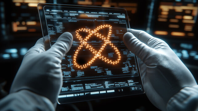 A scientist in gloves analyzes a glowing DNA sequence displayed on a futuristic digital screen, representing genetic research and medical innovation.