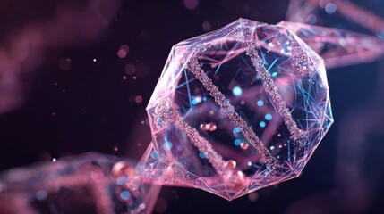 Macro shot of a DNA strand intertwined with fiber optic cables and light particles, symbolizing data flow and digital biology, glowing effects on dark background.