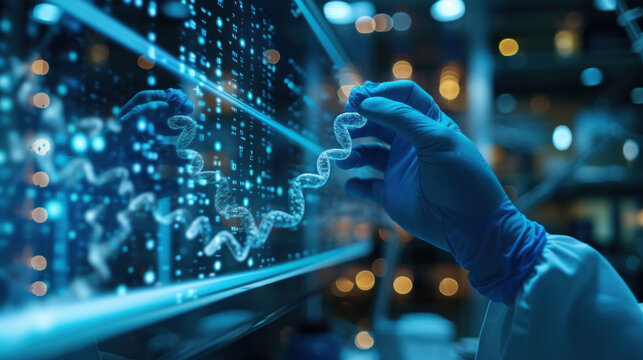 Female scientist explores the intricate details of DNA strands through augmented reality, highlighting the synergy of science and technology fabrication processes, and artificial life forms