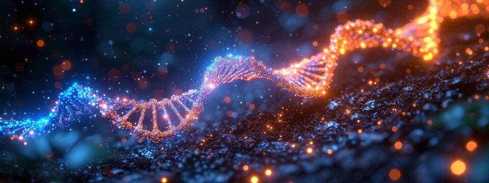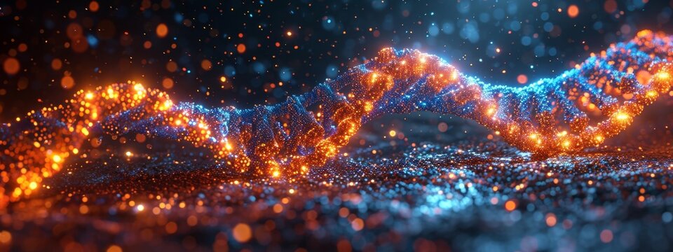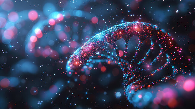 Digital dna strand with dynamic particle swirl on dark background