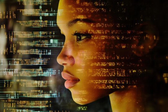 Abstract concept of a person's face merging with digital code, highlighting the interplay between genetics and programmed information