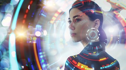 Futuristic data interface hovering over woman using smartphone