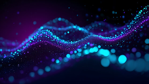 Abstract glowing blue and purple particles forming a wavy futuristic digital data stream on a dark background