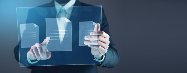 Businessman finger touch document management system hologram