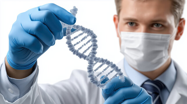 Scientist examines DNA double helix model with focus and precision, showcasing importance of genetic research and innovation
