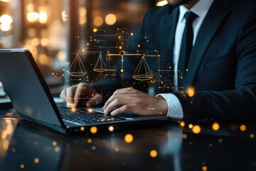A man is typing on a laptop with a screen that has a lot of legal symbols on it