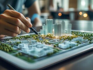 An architect is focused on designing a city layout on a digital tablet. The device displays a 3D model of buildings, green spaces, and urban infrastructure during a work session.