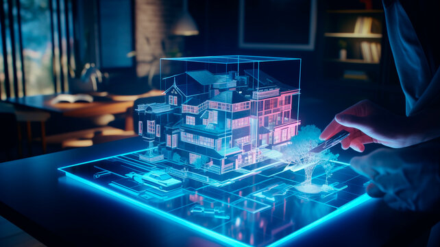Sketch design and drafting of wireframe of building a modern house becoming real. 3d illustration, Digital project visualization.