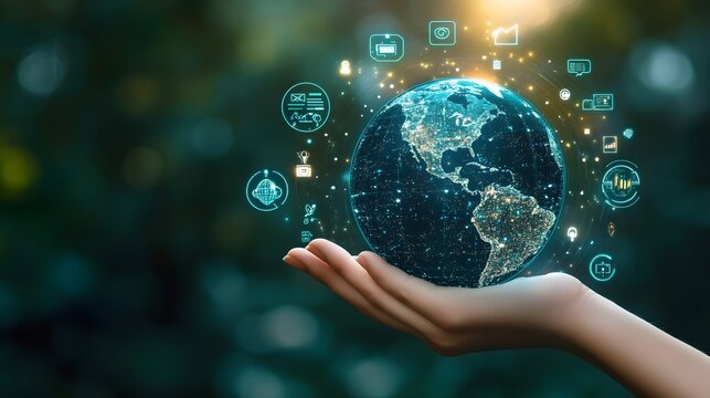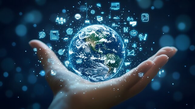 Hand with Earth Surrounded by Technology Icons: A hand holding the Earth, surrounded by floating technology icons, symbolizing the digital world's impact on the planet.