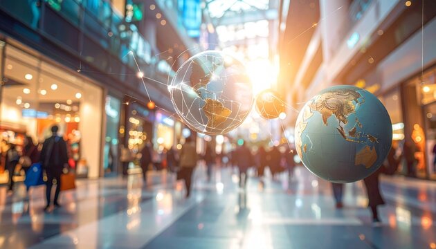 Digital globes floating above a bustling shopping mall, symbolizing global connectivity in modern commerce and the future of retail experience and international trade