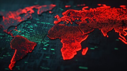 A digital map of the world displayed in red, set against a dark background, with binary code elements suggesting a technological or cybersecurity theme.