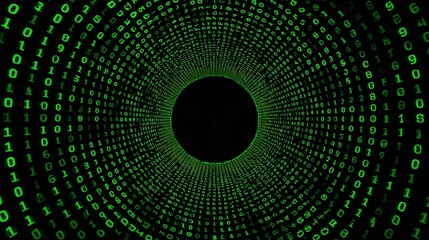 A tunnel of green binary code, symbolizing the world of technology and digital information. A black hole is in the center. The image has a futuristic feel.