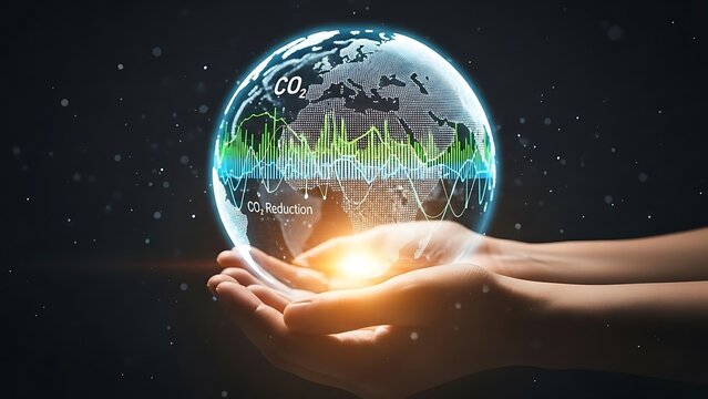 Hands holding the planet Earth with a digital overlay showing environmental data and CO2 levels, symbolizing global sustainability and climate change awareness