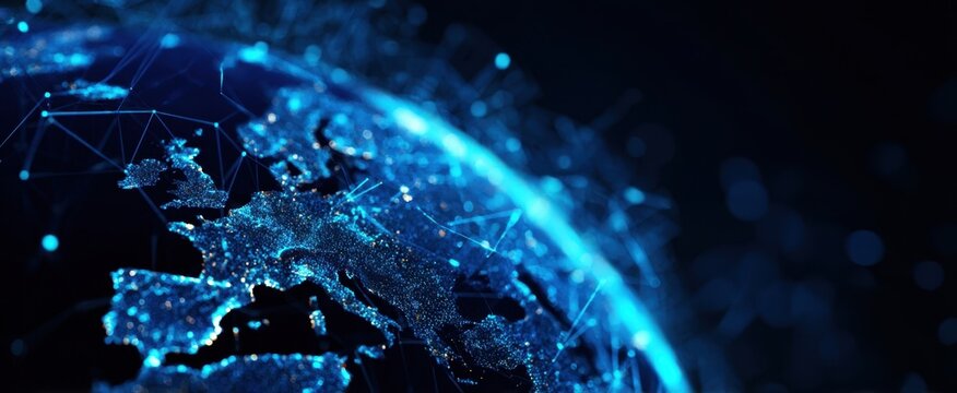 Digital earth globe with blue continents and connected dots against a black background space