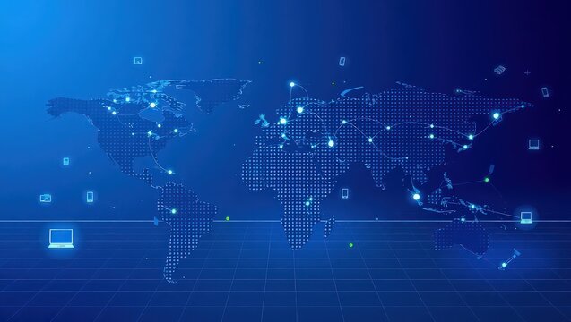 a digital globe with glowing connections representing global connectivity and data flow, set against the dark blue background of an abstract technology landscape Generative AI