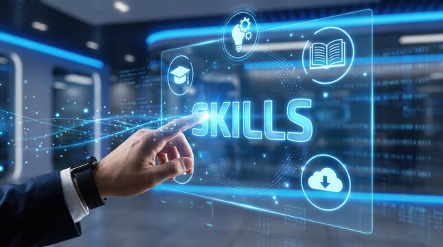 Businessman touching digital interface with education and career icons in a futuristic setting