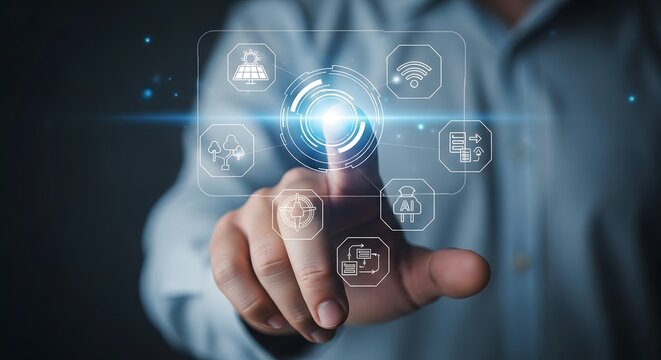 A hand touches a bright interface with hexagonal icons glowing in digital space