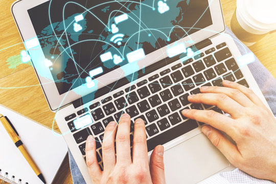 Person Typing on Laptop Keyboard with Digital Communication Icons, Online Networking and Customer Service Concept.