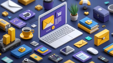 New email alert on laptop, communication connection message to global letters in the workplace.
