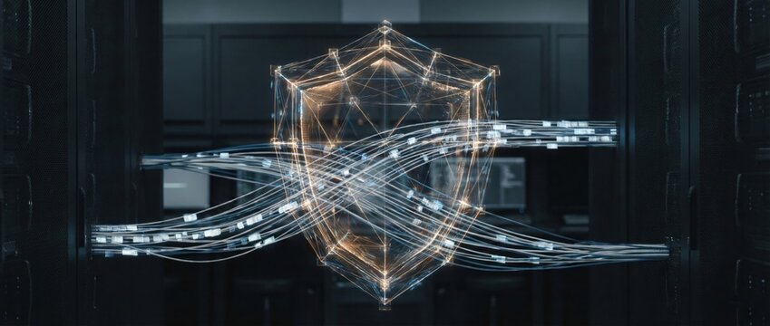 Futuristic digital shield securing data transfer between servers in high tech environment showcasing advanced network protection